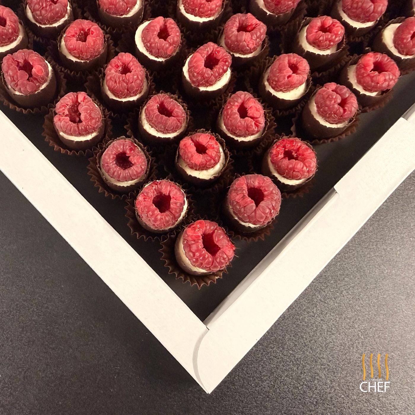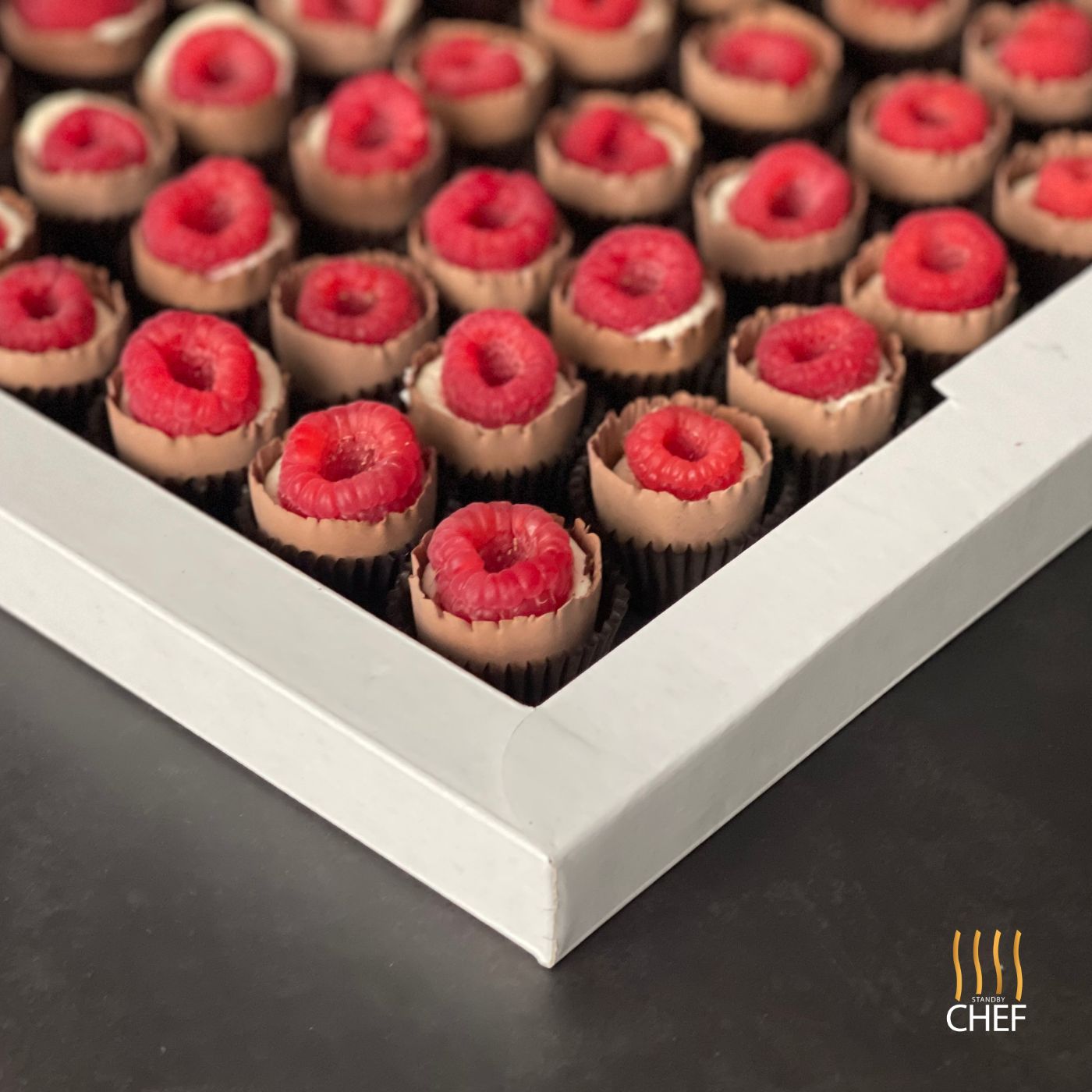 Indulge in these exquisite chocolate cups filled with creamy mascarpone and topped with a tangy raspberry compote. Perfect as petit fours or sweet canapé bites, they add a touch of elegance to any event.